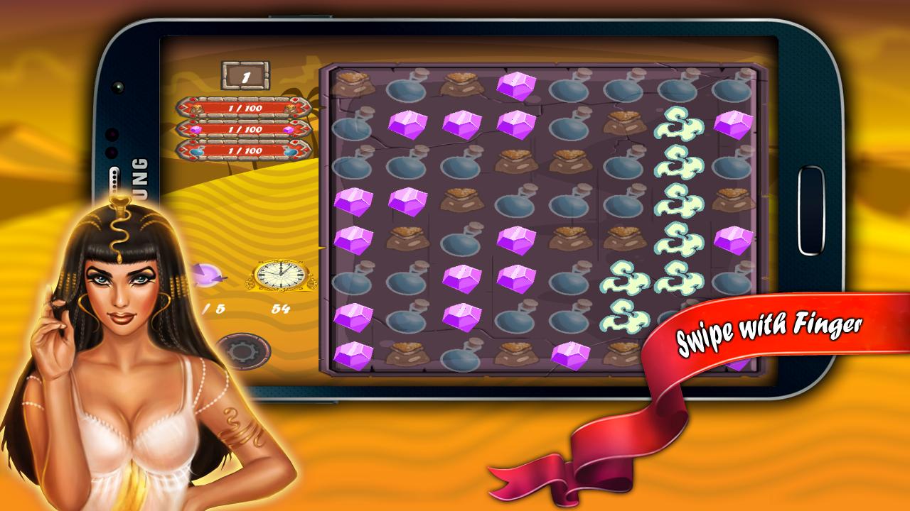 The main objective of the Booty of Cleopatra - Loot Flow is to play as a novice thief who tries to find a way to break in to the treasure room of the queen's of the Nile pyramid in this match symbol game. In order to get to the next level you will have to fight against the clock and just follow the flow of matching appropriate symbols. However, you will have to be really swift to make it in the given time. Moreover, mindless swiping wont make you go too far later in the game since you want to get the flow going as long as possible.